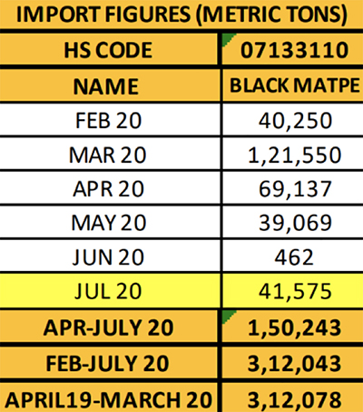 Presently, there are about 300,000 MT of black matpe inventories in Myanmar. India had set an import deadline of August 31 and a quota of 400,000 MT for the financial year that just ended.