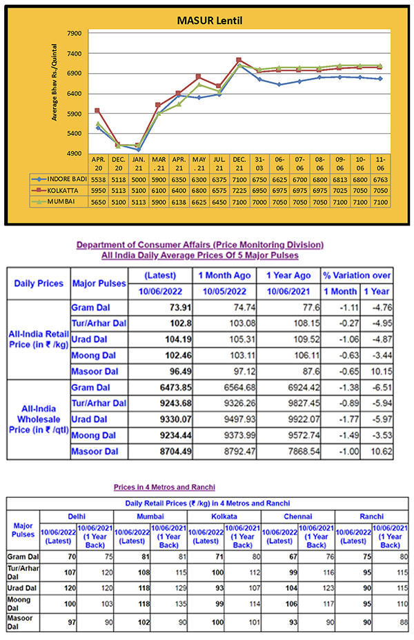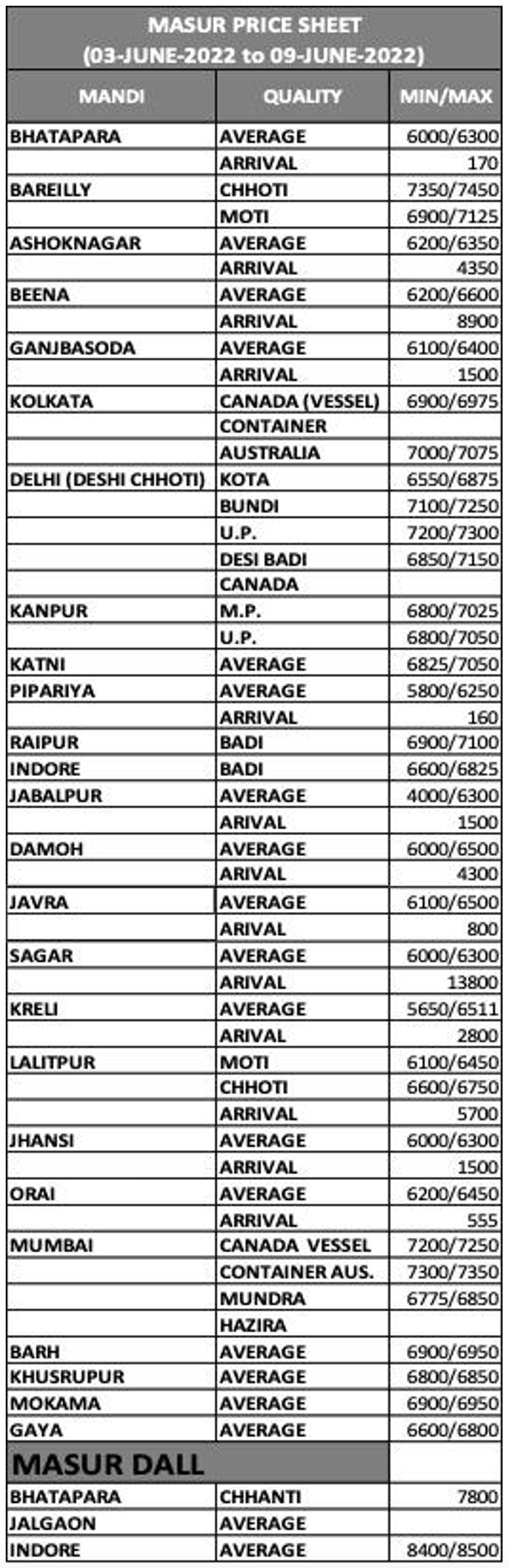 With the support of rising prices for whole lentils, masur dal prices increased by Rs. 100/200 to Rs. 7,900/8,500 per quintal.