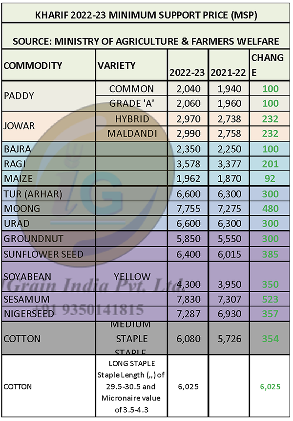 In pulses, the MSP of both tuar and urad has been increased from Rs. 6,300 to Rs. 6,600 per quintal. Mungbean has been increased from Rs. 7,275 to Rs. 7,755 per quintal. In oilseeds, groundnut increased from Rs. 5,550 to Rs. 5,850 per quintal, sunflower from Rs. 6,015 to Rs. 6,400, soybean from Rs. 3,950 to Rs. 4,300, sesame from Rs. 7,307 to Rs. 7,830 per quintal and Niger seed from Rs. 6,930 to Rs. 7,287 per quintal.