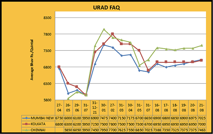 Due to the all-round increase, in Gulbarga urad rose by Rs. 200 to Rs. 5,000/7,411. Similarly, in Vijayawada prices increased by Rs. 150 to Rs. 7,350/7,550.