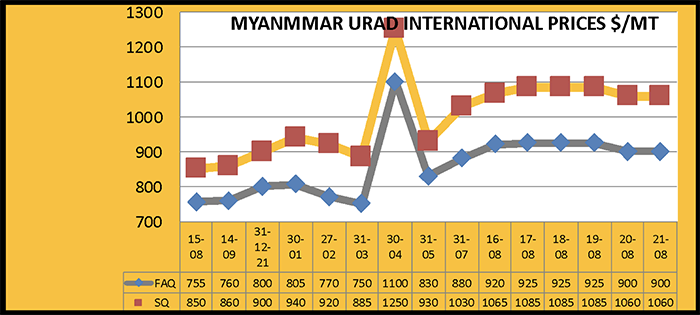 Last week in Burma, FAQ urad declined by $20 and SQ urad by $ 5 per tonne, meaning prices were at $ 900 and $ 1060 per tonne, respectively.