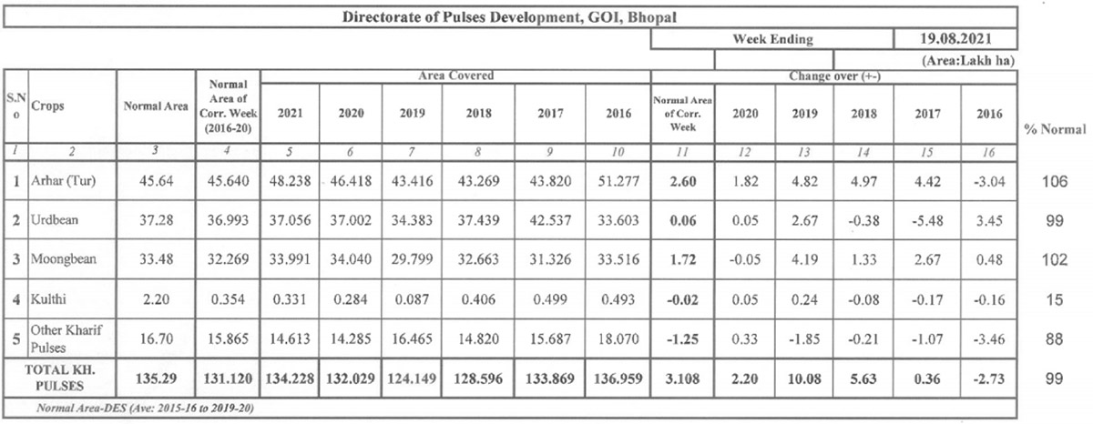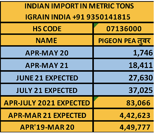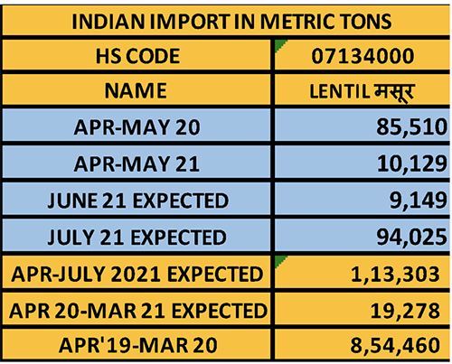 The import of lentils has been at a normal pace until now but is expected to increase substantially in the future. In the two months of April-May 2020, imports were 85,510 tonnes compared to 10,129 tonnes in April-May 2021. In June, the imports could reach only 9,149 tonnes but in July the quantity is expected to jump to 94,025 tonnes, taking the total import of lentils to an estimated 1,13,303 tonnes in the four months of April-July 2021. In the financial year 2019-20, the total import of lentils reached 8,54,460 tonnes.