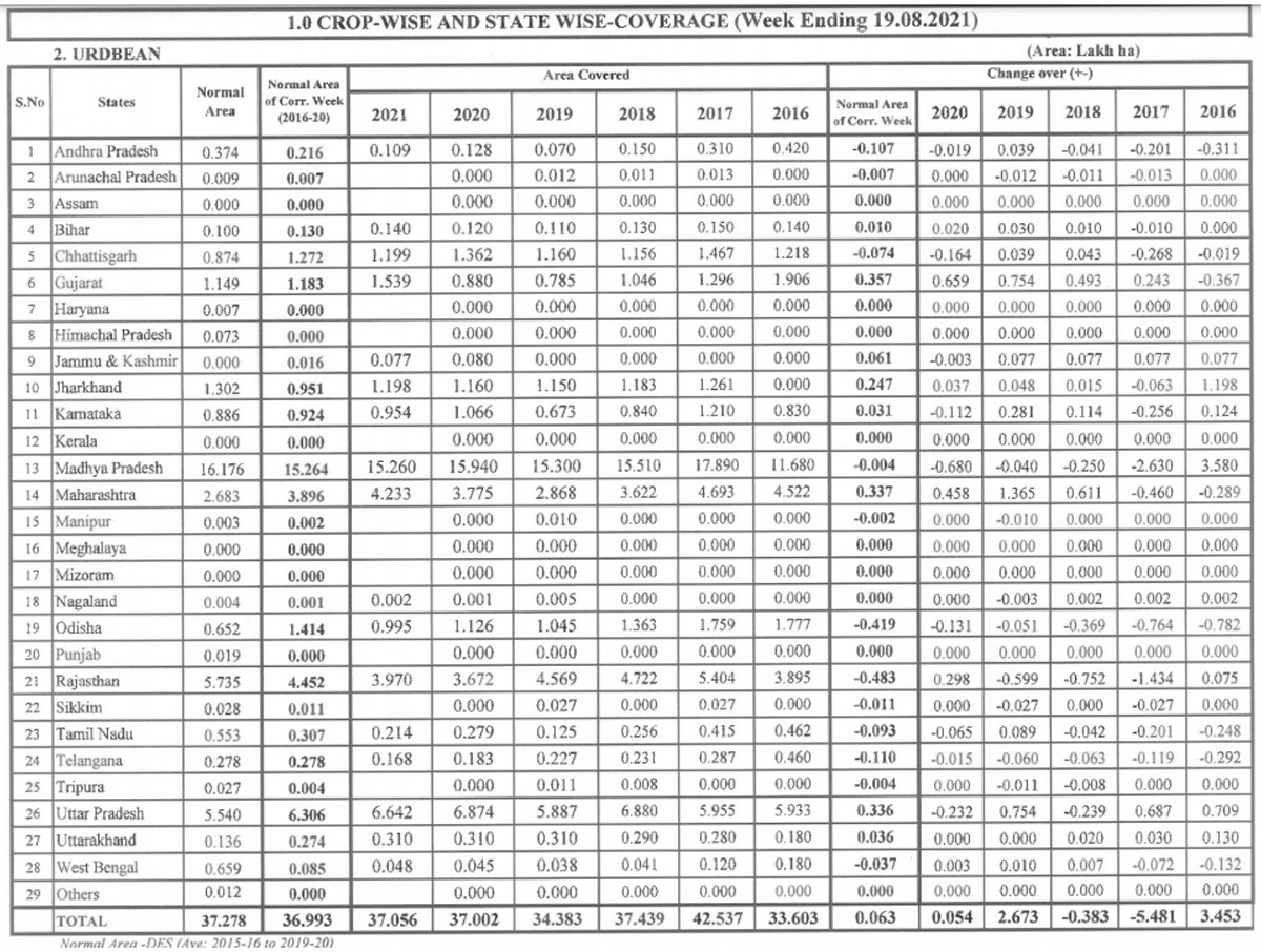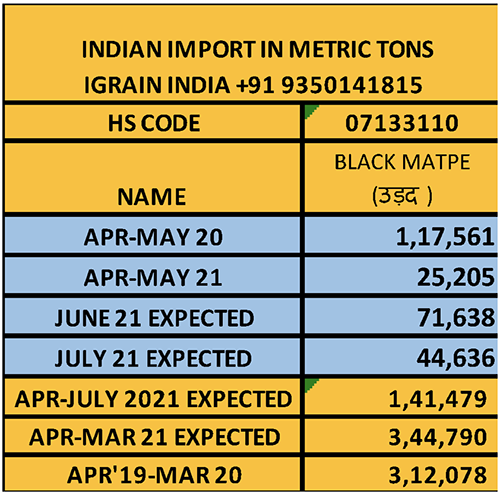 In April-May 2020, Urad import was 1,17,561 tonnes, but in April-May 2021 it came down to just 25,205 tonnes. The total import of urad during the first four months of the current financial year i.e., April-July 2021, is estimated to reach 1,41,479 tonnes from 71,638 tonnes in June and 44,636 tonnes in July. 3,44,790 tonnes were imported in the entire period (April-March) of the financial year 2020-21 and 3,12,078 tonnes in the financial year 2019-20. At that time, it was subject to an annual import quota, which has now been removed. Urad is mainly imported into India from Myanmar.